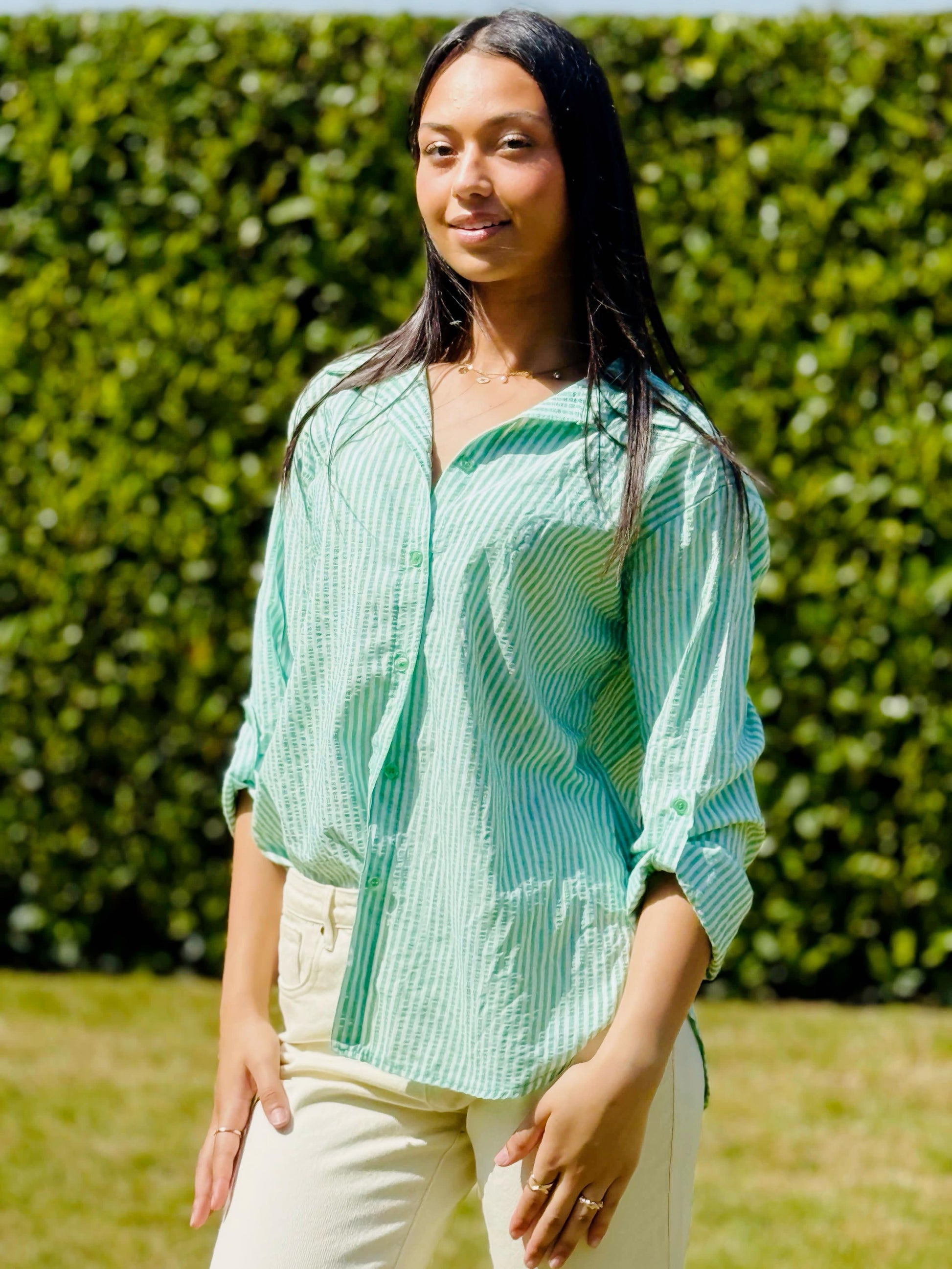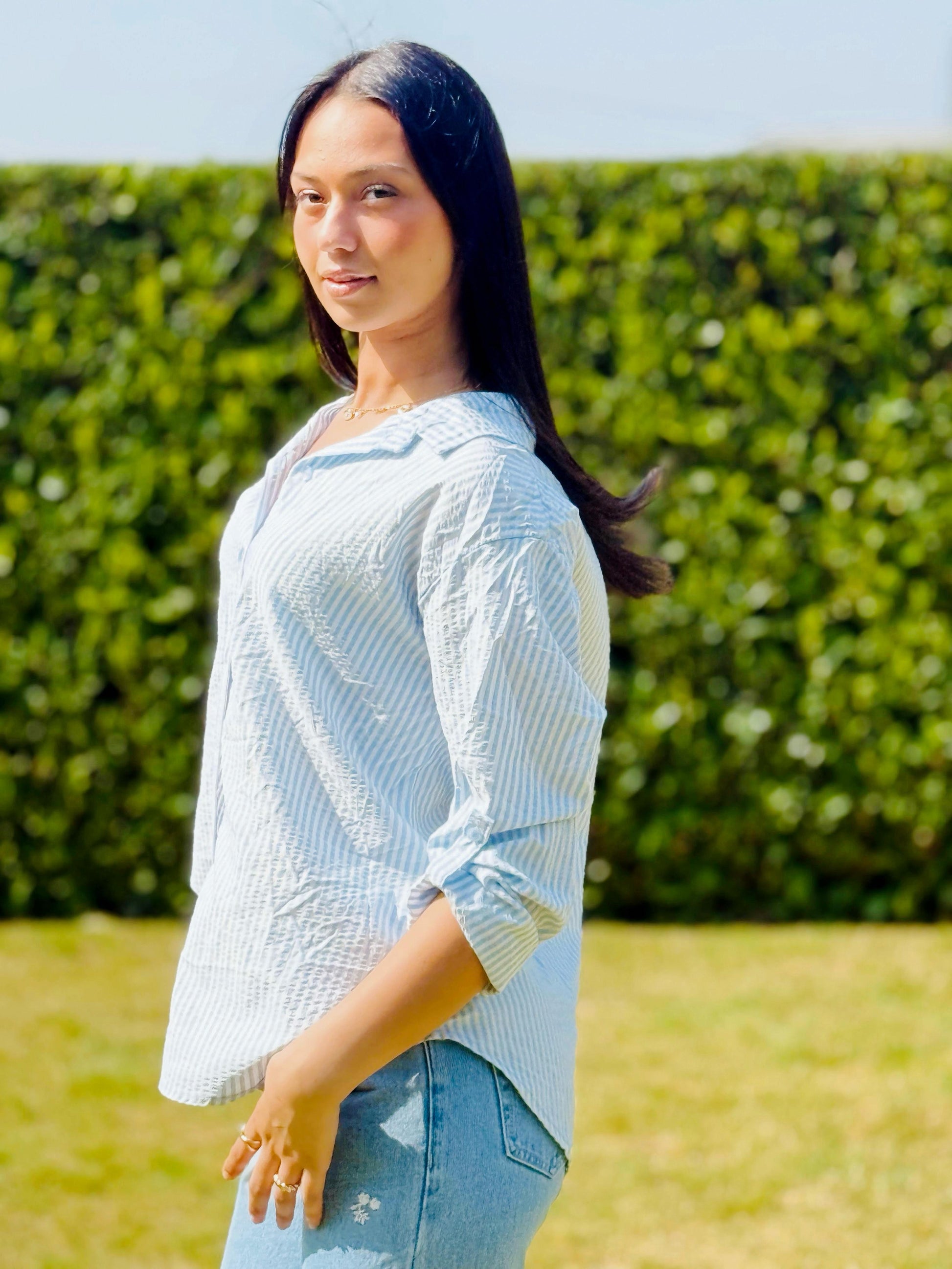 Adoptez un look frais et estival avec cette chemise rayée en coton texturé, parfaite pour les journées ensoleillées. Son tissu léger et respirant offre un confort optimal, tandis que sa coupe ample et fluide assure une silhouette décontractée. Avec ses fines rayures bleu ciel sur fond blanc et ses manches longues retroussables, elle se porte aussi bien rentrée dans un jean qu’en superposition sur un débardeur.