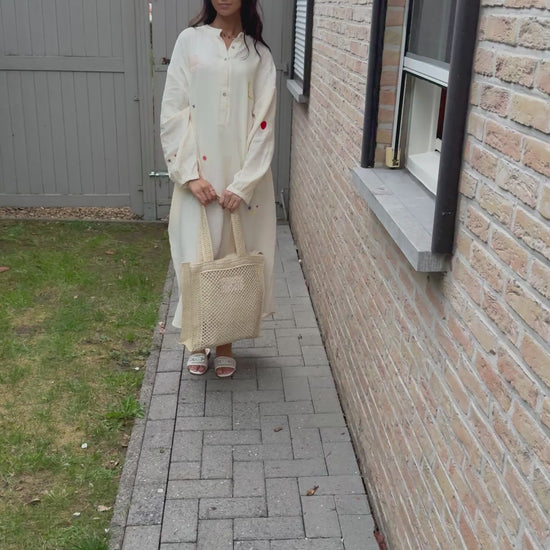 Plongez dans un univers de douceur et de fantaisie avec cette robe longue en gaze de coton à la texture légère et aérée. Parsemée de broderies délicates et colorées, elle offre une allure bohème chic tout en restant ultra confortable.