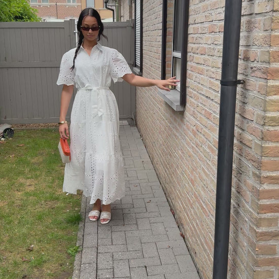 Apportez une touche de fraîcheur et d’élégance à votre garde-robe estivale avec cette robe longue blanche en broderie anglaise. Confectionnée dans un tissu 100 % coton léger et aéré, elle est parfaite pour les journées ensoleillées.