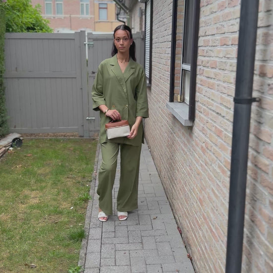 Adoptez un look à la fois moderne et sophistiqué avec ce tailleur kaki en lin fluide, idéal pour toutes les saisons. La veste oversize se distingue par ses manches 3/4 élégantes et ses boutons dorés raffinés, qui apportent une touche de luminosité subtile et chic.