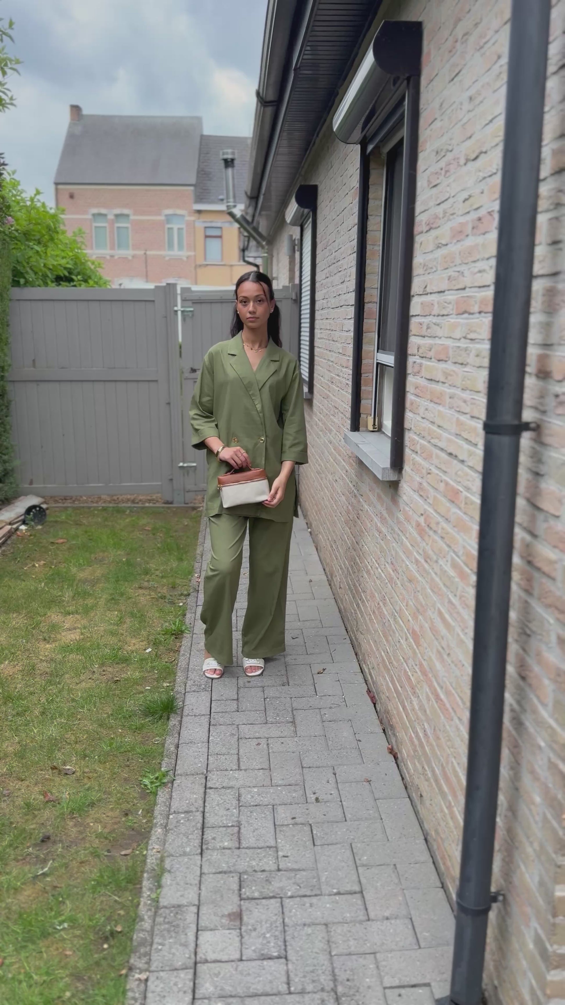 Ce tailleur kaki, alliant fluidité et détails soignés, est le choix parfait pour un style décontracté mais impeccable, du bureau aux sorties.